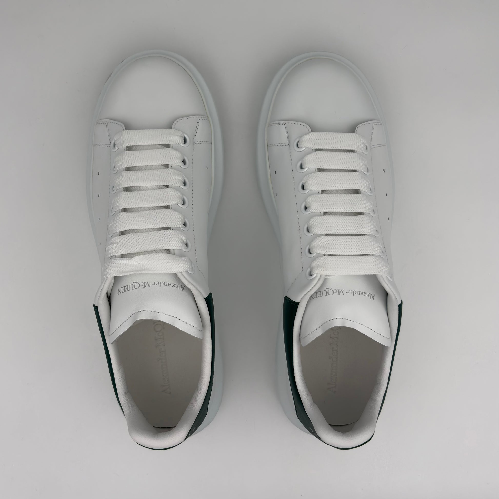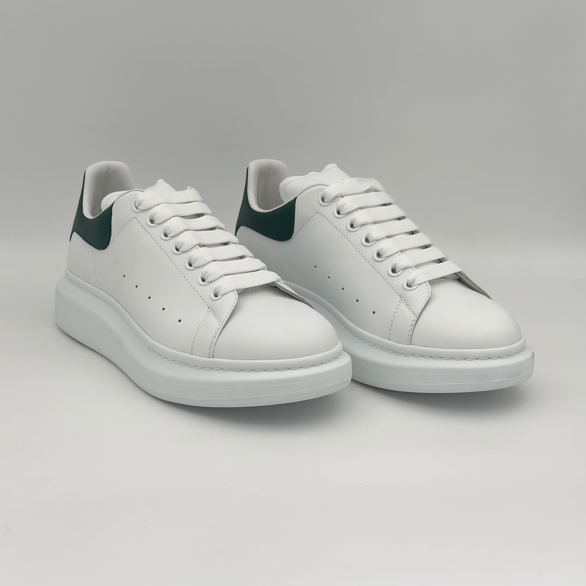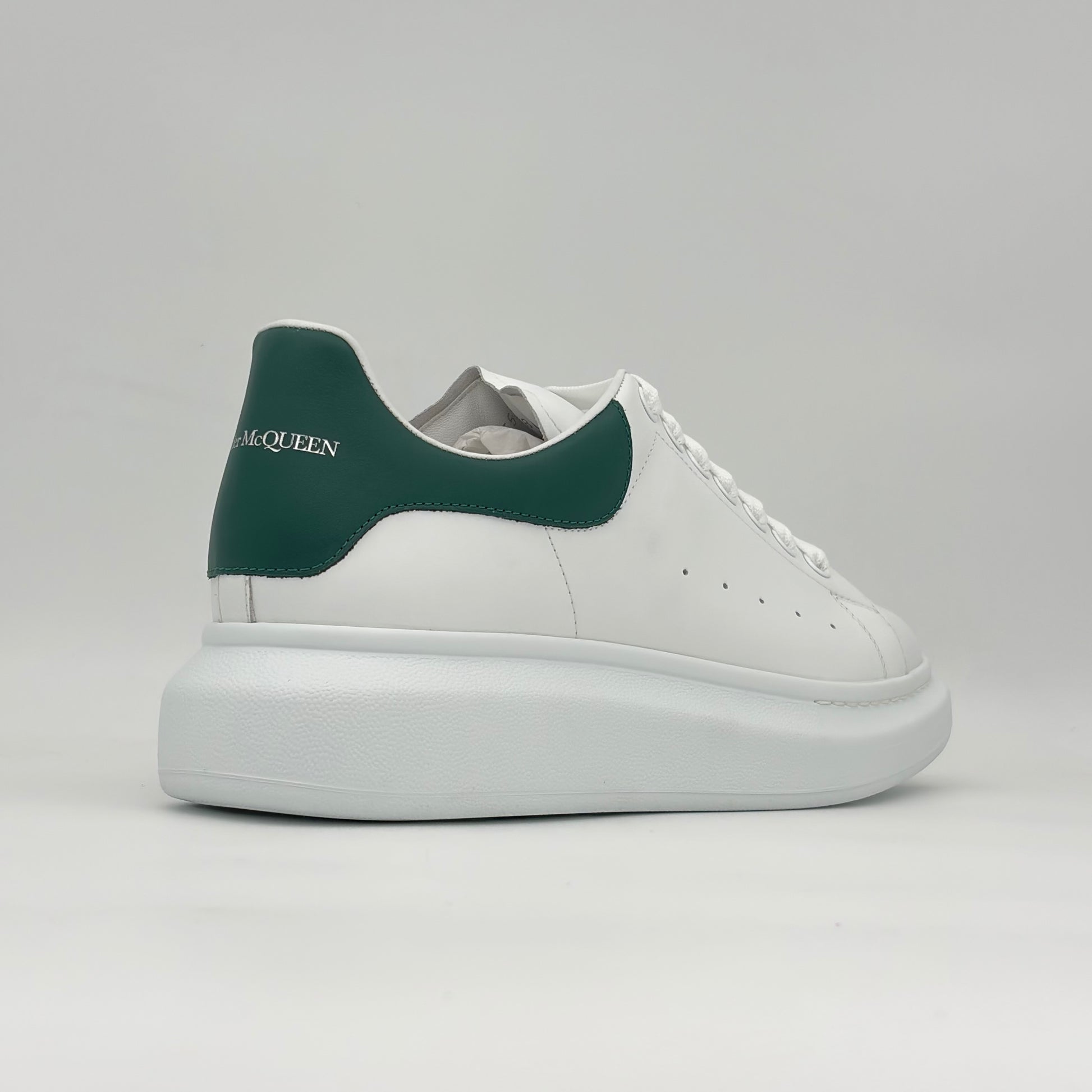 El clásico de McQueen: piel tono blanca premium, talón verde profundo y la suela oversized que define el estilo de la marca.