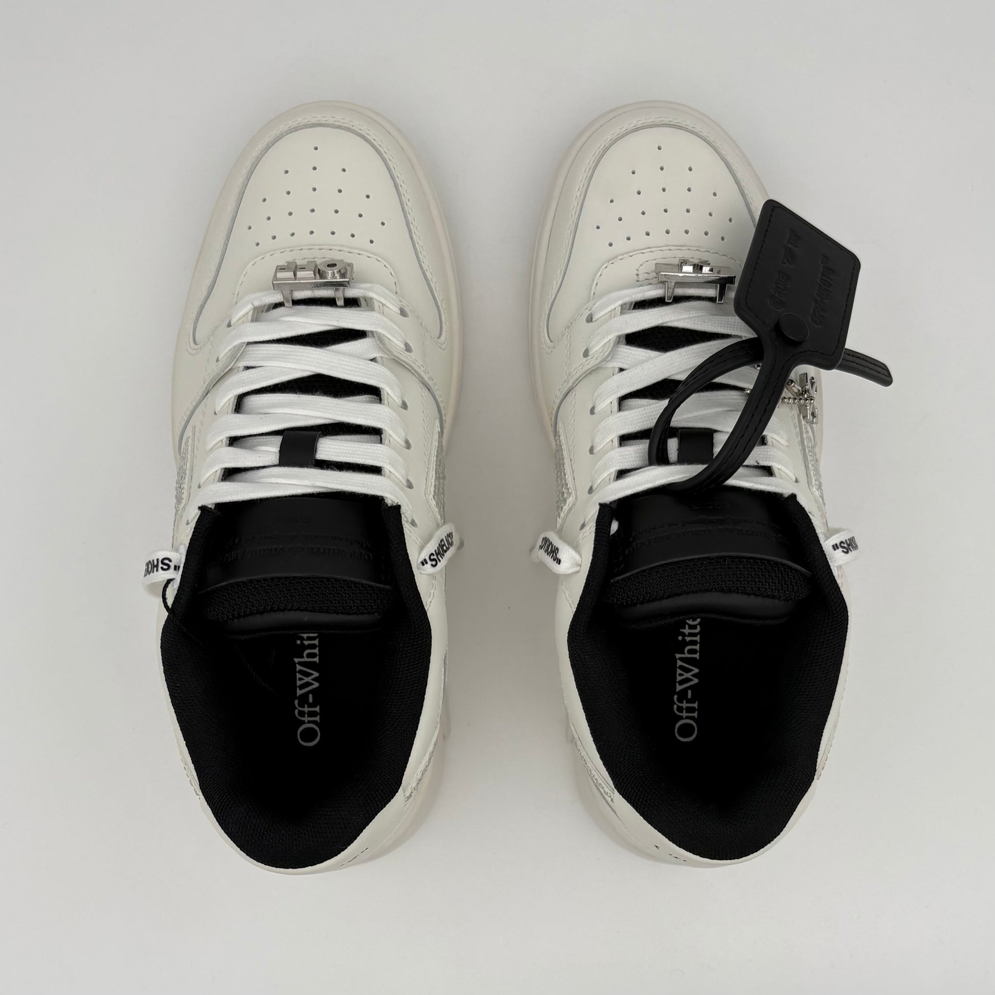 Sneakers premium de la silueta “Out of Office” de Off‑White con parte superior en cuero, detalles cristalinos, el hallmark de flechas y construcción italiana. Lujo urbano de alto impacto.